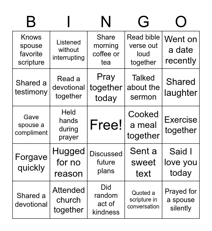 This bingo card has a free space and 24 words: Hugged for no reason, Attended church together, Pray together today, Shared a devotional, Went on a date recently, Knows spouse favorite scripture, Shared a testimony, Listened without interrupting, Cooked a meal together, Discussed future plans, Talked about the sermon, Gave spouse a compliment, Sent a sweet text, Said I love you today, Read a devotional together, Quoted a scripture in conversation, Exercise together, Share morning coffee or tea, Shared laughter, Held hands during prayer, Prayed for a spouse silently, Forgave quickly, Read bible verse out loud together and Did random act of kindness.