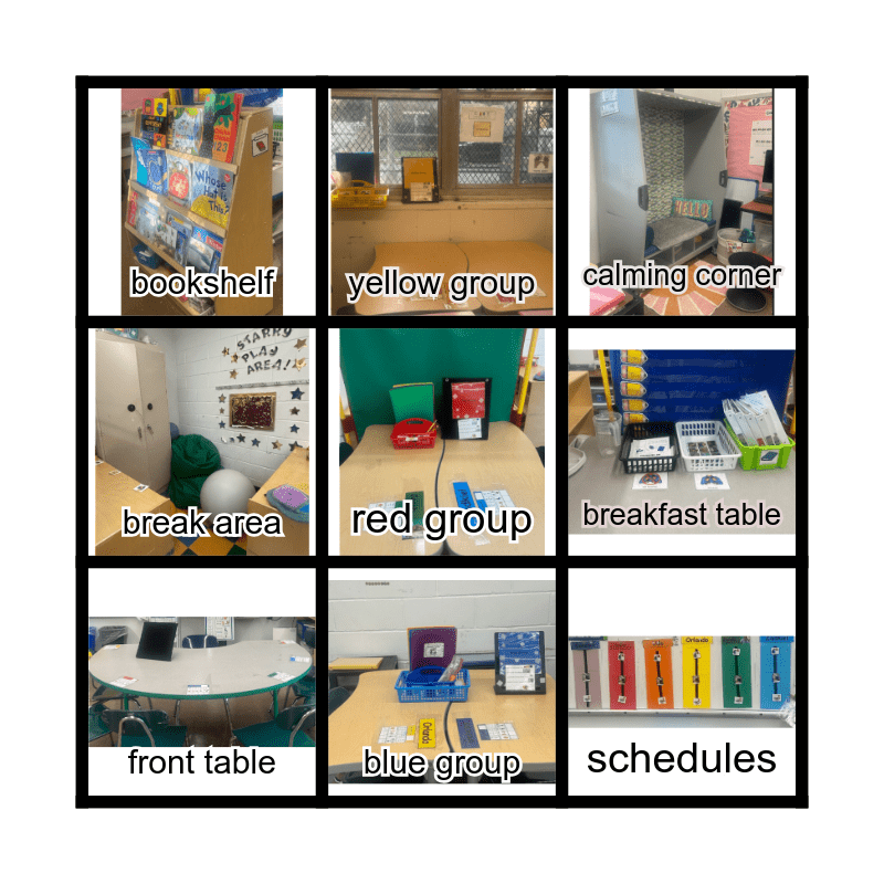This bingo card has 8 images, a free space and 8 words: breakfast table, calming corner, yellow group, front table, bookshelf, schedules, break area and blue group.