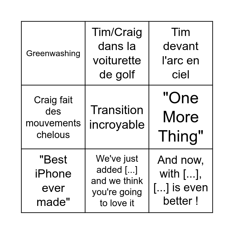 This bingo card has 9 words: "Best iPhone ever made", Tim devant l'arc en ciel, Tim/Craig dans la voiturette de golf, Craig fait des mouvements chelous, Greenwashing, "One More Thing", Transition incroyable, And now, with [...], [...] is even better ! and We've just added [...] and we think you're going to love it.