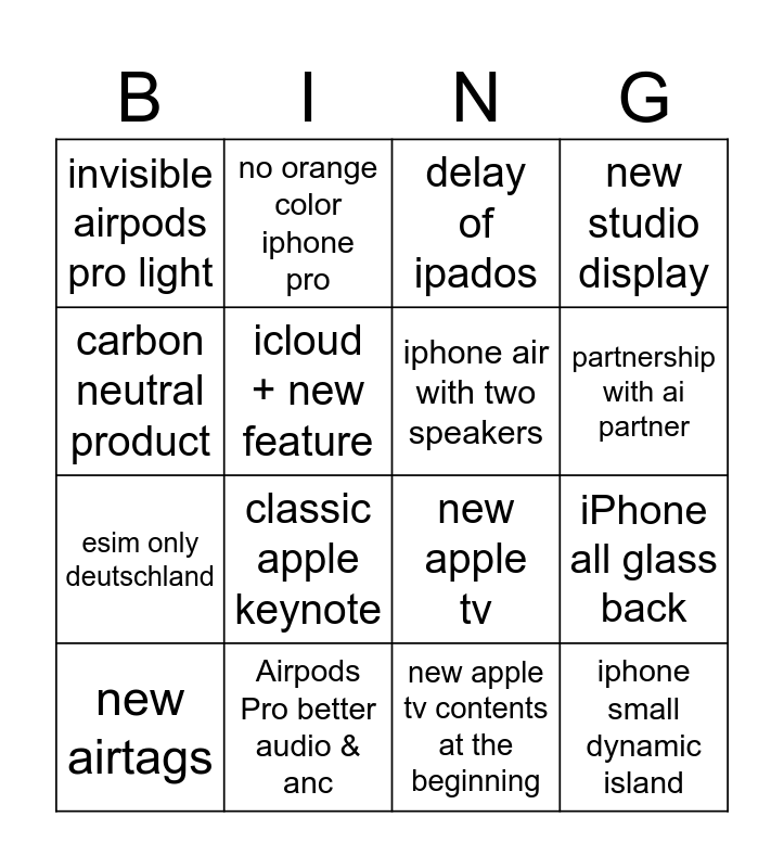This bingo card has 16 words: Airpods Pro better audio & anc, iPhone all glass back, delay of ipados, invisible airpods pro light, esim only deutschland, no orange color iphone pro, new apple tv, new apple tv contents at the beginning, carbon neutral product, icloud + new feature, new airtags, new studio display, classic apple keynote, partnership with ai partner, iphone air with two speakers and iphone small dynamic island.