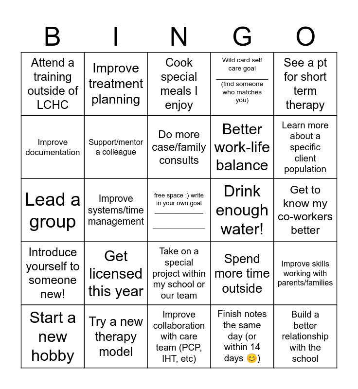 This bingo card has a free space and 24 words: Get licensed this year, Try a new therapy model, Do more case/family consults, Start a new hobby, See a pt for short term therapy, Attend a training outside of LCHC, Improve documentation, Improve treatment planning, Drink enough water!, Take on a special project within my school or our team, Better work-life balance, Lead a group, Spend more time outside, Improve skills working with parents/families, Support/mentor a colleague, Finish notes the same day (or within 14 days 😊), Get to know my co-workers better, Cook special meals I enjoy, Learn more about a specific client population, Improve systems/time management, Build a better relationship with the school, Introduce yourself to someone new!, Wild card self care goal ______________ (find someone who matches you) and Improve collaboration with care team (PCP, IHT, etc).