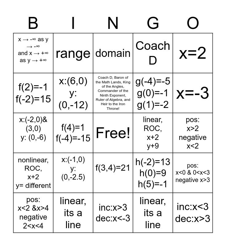 This bingo card has a free space and 24 words: x:(-1,0) y:(0,-2.5), linear, its a line, Coach D, Baron of the Math Lands, King of the Angles, Commander of the Ninth Exponent, Ruler of Algebra, and Heir to the Iron Throne!, pos: x<2 &x>4 negative 2<x<4, x=2, x → -∞ as y → -∞ and x → +∞ as y → +∞, f(2)=-1 f(-2)=15, range, linear, ROC, x+2 y+9, f(3,4)=21, g(-4)=-5 g(0)=-1 g(1)=-2, x:(-2,0)&(3,0) y: (0,-6), h(-2)=13 h(0)=9 h(5)=-1, pos: x<0 & 0<x<3 negative x>3, x:(6,0) y:(0,-12), linear, its a line, pos: x>2 negative x<2, domain, x=-3, f(4)=1 f(-4)=-15, inc:x<3 dec:x>3, nonlinear, ROC, x+2 y= different, Coach D and inc:x>3 dec:x<-3.