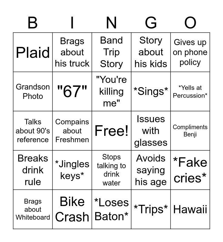 This bingo card has a free space and 29 words: Brags about Whiteboard, Brags about Bandroom, Compains about Freshmen, "Suck Less Everyday", Plaid, Band Trip Story, "67", *Jingles keys*, Issues with glasses, Bike Crash, Compliments Benji, Hawaii, *Loses Baton*, *Trips*, *Yells at Percussion*, Brags about Auditorium, Stops talking to drink water, Breaks drink rule, Gives up on phone policy, Talks about 90's reference, Avoids saying his age, *Dances*, *Sings*, Grandson Photo, Story about his kids, Brags about his truck, *Fake cries*, "You're killing me" and *Gives up and ends practice early*.
