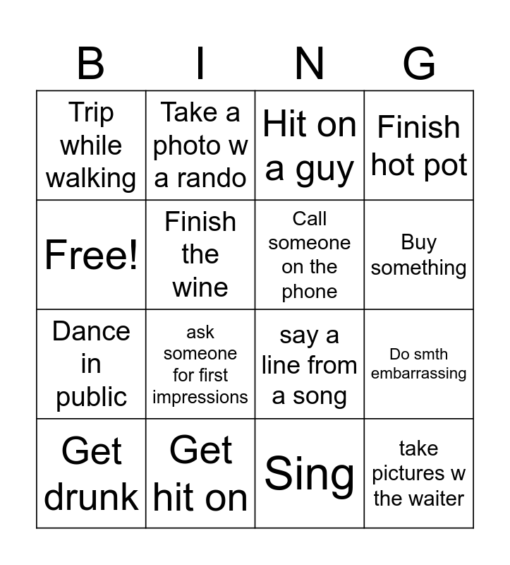 This bingo card has 16 words: Get hit on, Do smth embarrassing, Hit on a guy, Trip while walking, Dance in public, Take a photo w a rando, say a line from a song, Sing, Free!, Finish the wine, Get drunk, Finish hot pot, ask someone for first impressions, Buy something, Call someone on the phone and take pictures w the waiter.