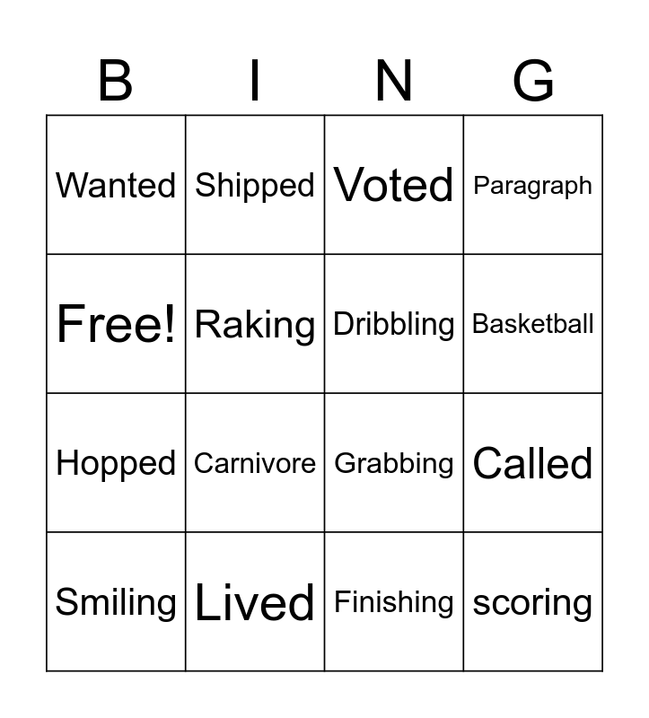 This bingo card has 16 words: Lived, Called, Voted, Wanted, Hopped, Shipped, Grabbing, Finishing, Free!, Raking, Smiling, Paragraph, Carnivore, Basketball, Dribbling and scoring.