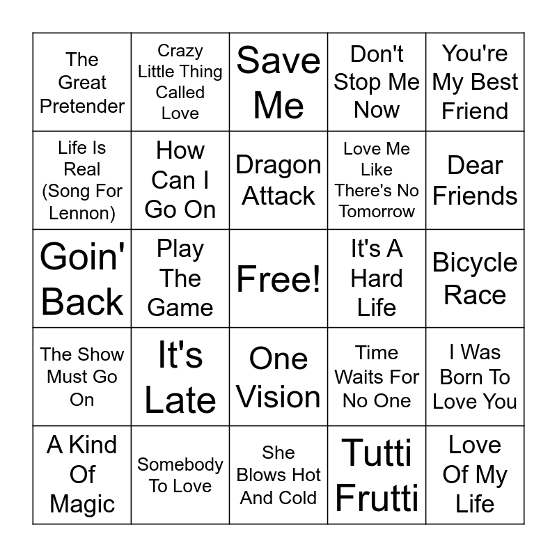 This bingo card has a free space and 70 words: Bohemian Rhapsody, Bicycle Race, We Are The Champions, Another One Bites The Dust, Somebody To Love, I Want To Break Free, Don't Stop Me Now, Killer Queen, You're My Best Friend, Radio Ga Ga, I Was Born To Love You, I Want It All, The Great Pretender, Save Me, Hammer To Fall, Play The Game, One Vision, Love Me Like There's No Tomorrow, Seven Seas Of Rhye, The Show Must Go On, It's A Hard Life, Time Waits For No One, Dear Friends, Barcelona, Mother Love, Mr. Bad Guy, Keep Yourself Alive, If You Can't Beat Them, Tutti Frutti, Las Palabras De Amor, Crazy Little Thing Called Love, In Only Seven Days, Who Needs You, There Must Be More To Life Than This, Made In Heaven, The Invisible Man, Good Old-Fashioned Lover Boy, 39, Love Kills, Life Is Real (Song For Lennon), You Take My Breath Away, It's Late, Love Of My Life, I'm In Love With My Car, Dear Friends, How Can I Go On, A Kind Of Magic, I'm Going Slightly Mad, Made In Heaven, There Must Be More To Life Than This, Too Much Love Will Kill You, Who Wants To Live Forever, Man Made Paradise, Living On My Own, She Blows Hot And Cold, Headlong, Dragon Attack, Love Me Like There's No Tomorrow, How Can I Go On, Guide Me Home, Goin' Back, My Love Is Dangerous, Let's Turn It On, Some Day One Day, Misfire, She Makes Me (Stormtrooper In Stilettos), Dancer, Calling All Girls, Cool Cat and Put Out The Fire.