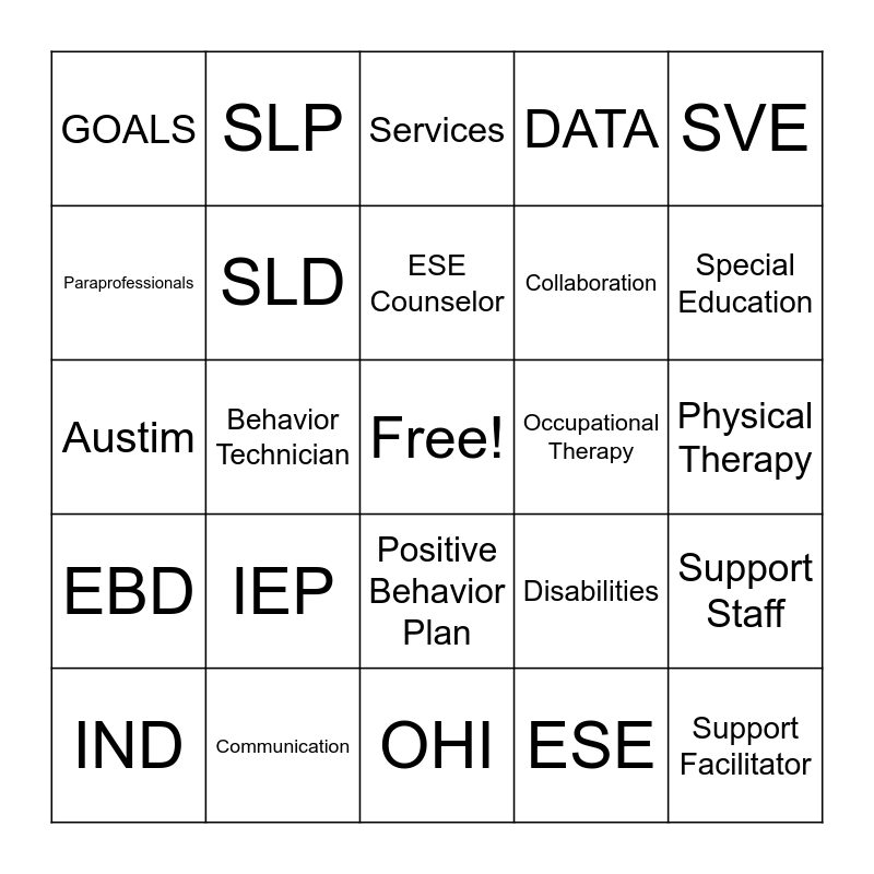 This bingo card has a free space and 24 words: IEP, Communication, ESE Counselor, IND, SVE, GOALS, Paraprofessionals, SLP, Occupational Therapy, Positive Behavior Plan, Collaboration, Austim, Disabilities, Support Staff, SLD, ESE, Physical Therapy, Services, Special Education, Behavior Technician, Support Facilitator, EBD, DATA and OHI.