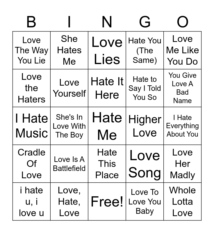 This bingo card has 31 words: Free!, I Hate Myself for Loving You, She's In Love With The Boy, Can't Help Falling In Love With You, Love The Way You Lie, Love Lies, Love Yourself, Love Song, Higher Love, Love To Love You Baby, I Hate Everything About You, Hate Me, Whole Lotta Love, Somebody To Love, You Give Love A Bad Name, Crazy Little Thing Called Love, Love Her Madly, Love Is A Battlefield, Cradle Of Love, Hate This Place, Love Me Like You Do, I Hate Love Songs, i hate u, i love u, She Hates Me, Hate to Say I Told You So, Love the Haters, Hate You (The Same), I Hate Music, Love, Hate, Love, Hate It Here and Hate It When You See Me Cry.