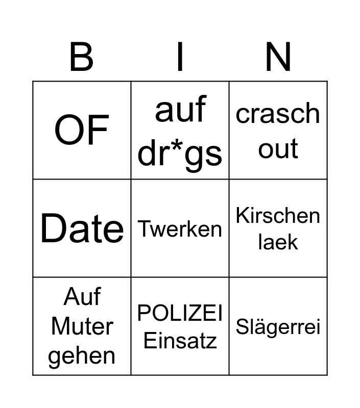 This bingo card has a free space and 8 words: Kirschen laek, crasch out, auf dr*gs, Auf Muter gehen, OF, Slägerrei, Date and POLIZEI Einsatz.
