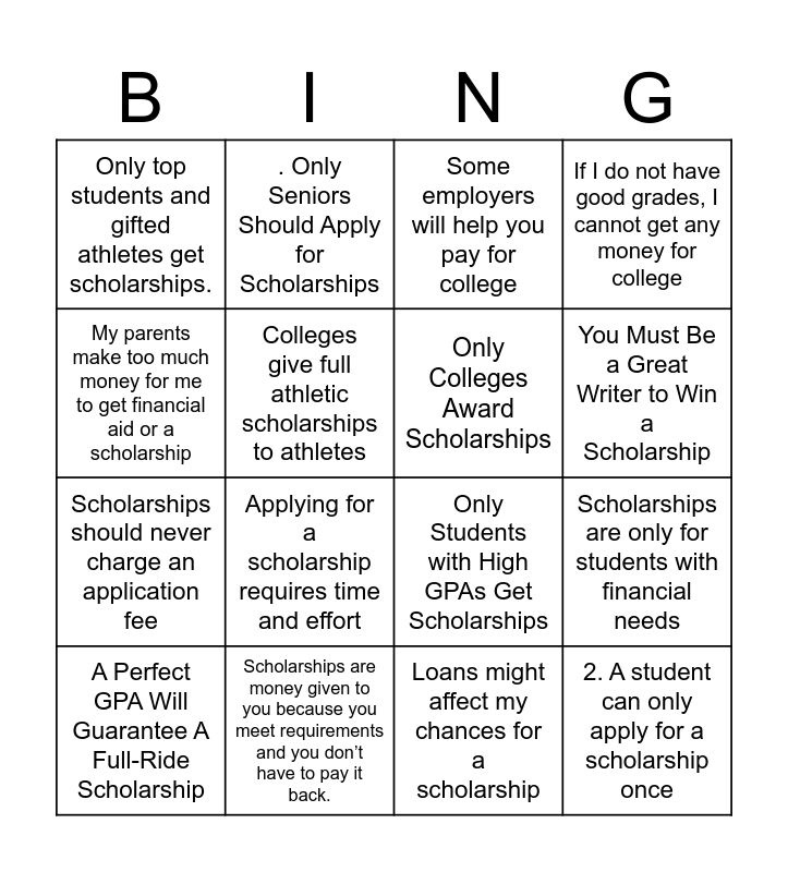 This bingo card has 16 words: Scholarships are money given to you because you meet requirements and you don’t have to pay it back., Scholarships are only for students with financial needs, Some employers will help you pay for college, Only top students and gifted athletes get scholarships., Scholarships should never charge an application fee, . Only Seniors Should Apply for Scholarships, Only Students with High GPAs Get Scholarships, Loans might affect my chances for a scholarship, My parents make too much money for me to get financial aid or a scholarship, Colleges give full athletic scholarships to athletes, A Perfect GPA Will Guarantee A Full-Ride Scholarship, If I do not have good grades, I cannot get any money for college, Applying for a scholarship requires time and effort, You Must Be a Great Writer to Win a Scholarship, Only Colleges Award Scholarships and 2. A student can only apply for a scholarship once.