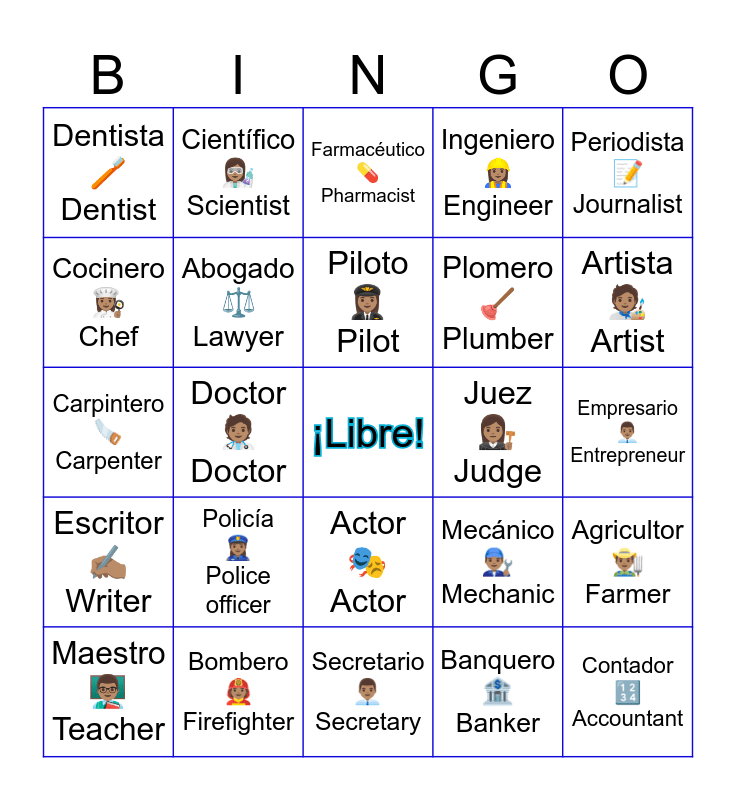 This bingo card has a free space and 29 words: Maestro👨🏽🏫 Teacher, Profesor 👩🏽🏫🎓 Professor, Doctor 🧑🏽⚕️ Doctor, Enfermero 💉 Nurse, Dentista 🪥 Dentist, Farmacéutico 💊Pharmacist, Abogado ⚖️ Lawyer, Policía 👮🏽♀️ Police officer, Juez 👩🏽⚖️ Judge, Bombero🧑🏽🚒 Firefighter, Empresario 👨🏽💼Entrepreneur, Contador 🔢 Accountant, Secretario👨🏽💼 Secretary, Banquero🏦 Banker, Artista🧑🏽🎨 Artist, Cantante👨🏽🎤 Singer, Actor 🎭 Actor, Escritor ✍🏽 Writer, Periodista📝 Journalist, Carpintero 🪚Carpenter, Mecánico 👨🏽🔧 Mechanic, Electricista ⚡ Electrician, Plomero🪠 Plumber, Cocinero👩🏽🍳 Chef, Ingeniero👷🏽♀️ Engineer, Científico👩🏽🔬 Scientist, Agricultor👨🏽🌾 Farmer, Piloto 👩🏽✈️ Pilot and Estudiante 🧑🏽🎓 Student.