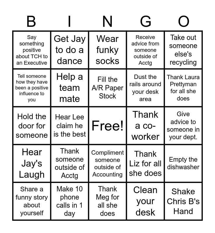 This bingo card has 40 words: Compliment a team mate, Hold the door for someone, Smile and receive a smile back, Help a team mate, Make 10 phone calls in 1 day, Compliment someone outside of Accounting, Fill the A/R Paper Stock, Fill the Sales Area Paper Stock, Take out someone else's recycling, Hear Jay's Laugh, Hear Lee claim he is the best, Receive advice from someone outside of Acctg, Free!, Give advice to someone in your dept., Thank a co-worker, Thank someone outside of Acctg, Shake Dylan T's hand, Say something positive about TCH to an Executive, Help at the front desk, Wear funky socks, Empty the dishwasher, Clean your desk, Dust the rails around your desk area, Tell someone how they have been a positive influence to you, Join someone new for lunch, Take the steps, Tell a clean joke to a co-worker, Arrive on time all week, Shake Chris B's Hand, Introduce yourself to someone new, Tell someone new why you love TCH, Share a funny story about yourself, Tell a co-worker about a TCH moment you are proud of, Thank Liz for all she does, Thank Laura Prettyman for all she does, Thank Meg for all she does, Tell Mohamed something positive about one of his employees, Let Bonnie know how she has helped you and thank her, Get Jay to do a dance and Hear a comment about it being cold in the office.