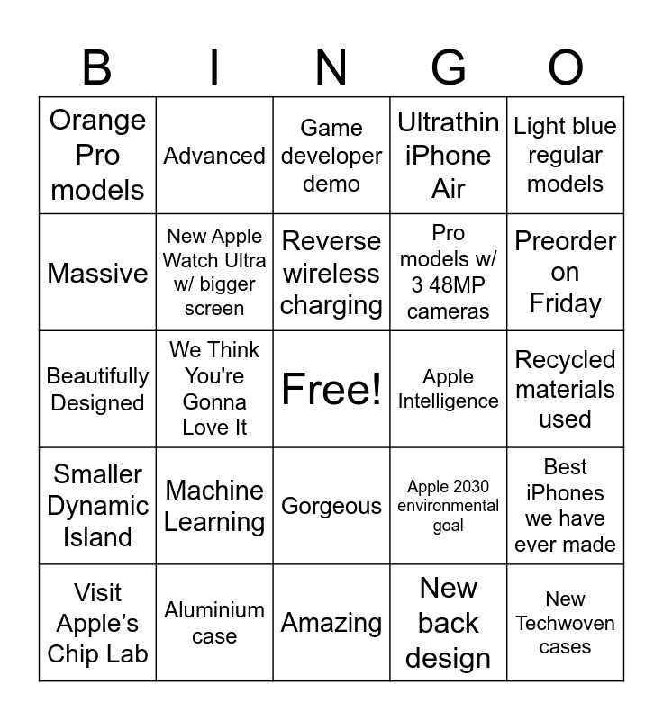 This bingo card has a free space and 58 words: Thicker Pro Max model, Aluminium case, Biggest battery in iPhone, Smaller Dynamic Island, New back design, AirPods Pro 3 w/ heart rate sensor, New Apple Watch Ultra w/ bigger screen, Vapor chamber cooling system, Pro models w/ 3 48MP cameras, Recap Liquid Glass UI Changes in iOS26, Ultrathin iPhone Air, Apple designed Wifi 7 chip in Pro, All phones with 120Hz ProMotion display, Qi2 25W Wireless MagSafe charging, 8x optical zoom in Pro, Orange Pro models, New Techwoven cases, Light blue regular models, Exclusive blue color for Air, Reverse wireless charging, Apple Intelligence, Game developer demo, Visit Apple’s Chip Lab, Best iPhones we have ever made, These are the new iPhones, Recycled materials used, Available Today, Available This Week, Preorder on Friday, Saying “5X” Instead of “5 Times", Let's Take a Look, Never Before, Stunning, Look at That, Really Cool, Incredible, Shot on iPhone, We Think You're Gonna Love It, Beautifully Designed, Revolutionary, Machine Learning, For the First time, Apple 2030 environmental goal, Computational photography, Tremendous, Fantastic, Remarkable, Gorgeous, Amazing, Innovative, Better than ever, Breakthrough, Next-generation, Immersive, Advanced, Exciting, Massive and It’s a big day for Apple.