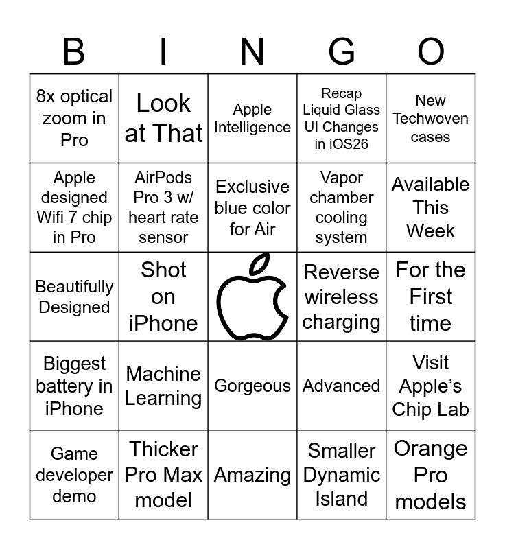 This bingo card has a free space and 59 words: 2025, Thicker Pro Max model, Aluminium case, Biggest battery in iPhone, Smaller Dynamic Island, New back design, AirPods Pro 3 w/ heart rate sensor, New Apple Watch Ultra w/ bigger screen, Vapor chamber cooling system, Pro: 48MP ultrawide camera, Recap Liquid Glass UI Changes in iOS26, Ultrathin iPhone Air, Apple designed Wifi 7 chip in Pro, All phones with 120Hz ProMotion display, Qi2 25W Wireless MagSafe charging, 8x optical zoom in Pro, Orange Pro models, New Techwoven cases, Light blue regular models, Exclusive blue color for Air, Reverse wireless charging, Apple Intelligence, Game developer demo, Visit Apple’s Chip Lab, Best iPhones we have ever made, These are the new iPhones, Recycled materials used, Available Today, Available This Week, Preorder on Friday, Saying “5X” Instead of “5 Times", Let's Take a Look, Never Before, Stunning, Look at That, Really Cool, Incredible, Shot on iPhone, We Think You're Gonna Love It, Beautifully Designed, Revolutionary, Machine Learning, For the First time, Apple 2030 environmental goal, Computational photography, Tremendous, Fantastic, Remarkable, Gorgeous, Amazing, Innovative, Better than ever, Breakthrough, Next-generation, Immersive, Advanced, Exciting, Massive and It’s a big day for Apple.