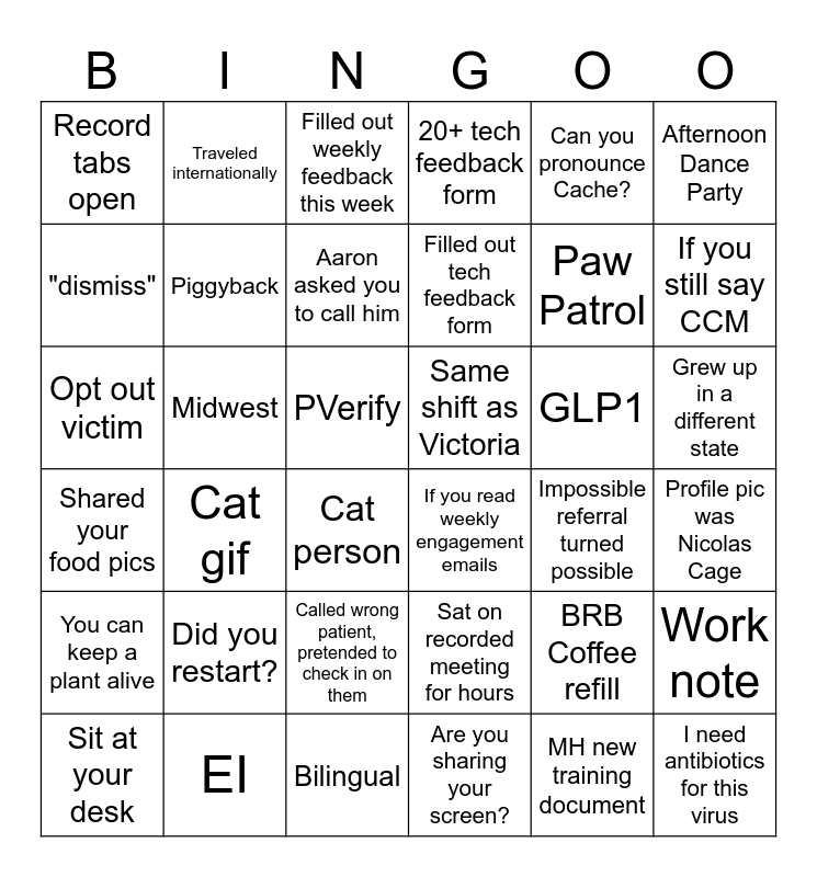 This bingo card has 110 words: West Coast, East Coast, Midwest, OPE, Victim of AZ Timezone, Double Bookings, Circle back, Massage a client, Ope you're muted, Are you sharing your screen?, Wildlife spotting, Met with coworker in real life, Guatemala, Showed up to work at wrong time, Said Happy Friday when it was in fact not Friday, Family plan, Paw Patrol, Oh no not another rash, On hold with insurance longer than 10 minutes, Danced to hold music, Cat gif, Dog gif, The Office gif, Sent task to nowhere, 3+ meetings with Dave in one day, Piggyback, Can you pronounce Cache?, Did you restart?, Claude gave you a new name, Watched a Greg training video, Filled out tech feedback form, 20+ tech feedback form, Filled out weekly feedback this week, Rick Rolled someone, Met with a patient in a weird place: car, bath tub, closet, Opt out victim, Amazified something, Said hello in wrong chat, If you read weekly engagement emails, Chad- GPT, If you know what PEPM stands for, ROI, Aaron asked you to call him, If you still say CCM, Shared your food pics, PAGrx victim, BRB Coffee refill, Diet coke addict, Worked during a natural disaster, Sat on recorded meeting for hours, Knife emoji, Pineapple emoji, Profile pic was Nicolas Cage, Weird excuse to step away: lizard emergency, jackhammer outside,, Felt judged by Claude, DoorDash, Joined Amaze in 2025, Worked from a different office location, Gravity Forms, "dismiss", Record tabs open, Lunch and Learn, CANT GET INTO ACCOUNT, Onboarding or working in PJs, Interviewed by Dave, GLP1, Standing desk, Walking pad, Sit at your desk, Bilingual, Grandparent, Furbaby, Traveled internationally, Brought your dog to work, Lost your note, Found typo in portal, Child ran in, PVerify, Called wrong patient, pretended to check in on them, EI, Pharmacy gaslighting, I need antibiotics for this virus, Work note, ALL CAPS WHY ARE YOU YELLING, Toilet emoji, You can keep a plant alive, Beck, LPR, Can someone go active?, Drop them files, Peer Support Partner, Afternoon Dance Party, More than 1 beverage on your desk right now, Same shift as Victoria, Early bird, Night Owl, Midshifter, Worked a weekend at Amaze, Appointment Feature Feedback, Impossible referral turned possible, RR, BRB, Dog person, Cat person, Grew up in a different state, Dog duties, Starbucks run, Spilled coffee on keyboard, MH new training document and You cannot keep a plant alive.