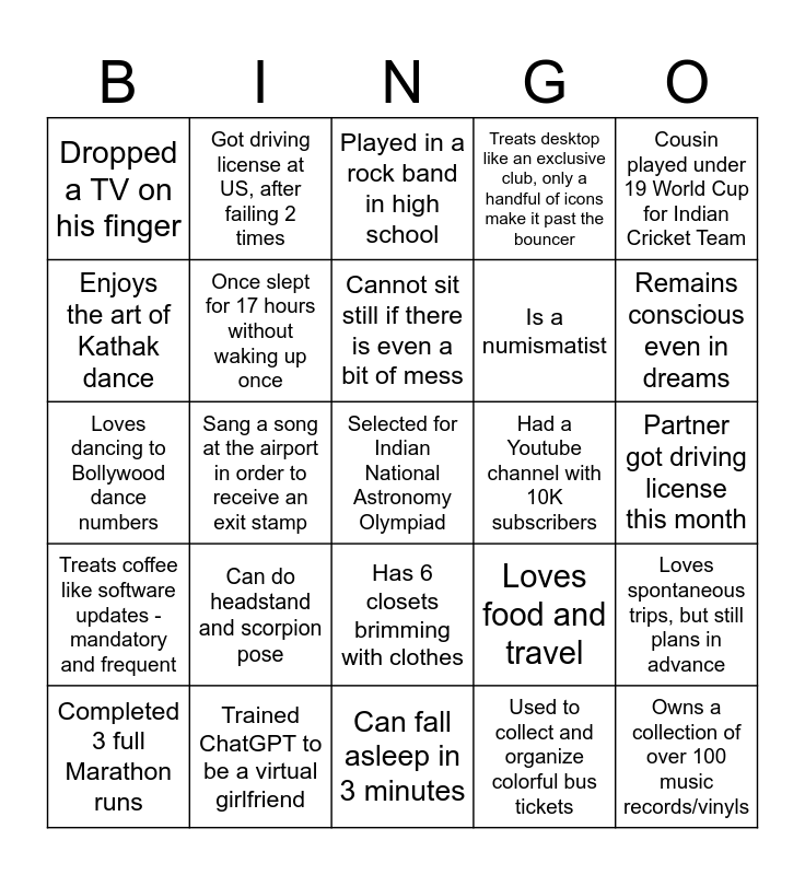 This bingo card has 25 words: Can do headstand and scorpion pose, Can fall asleep in 3 minutes, Cannot sit still if there is even a bit of mess, Completed 3 full Marathon runs, Cousin played under 19 World Cup for Indian Cricket Team, Dropped a TV on his finger, Enjoys the art of Kathak dance, Got driving license at US, after failing 2 times, Had a Youtube channel with 10K subscribers, Has 6 closets brimming with clothes, Is a numismatist, Loves dancing to Bollywood dance numbers, Loves food and travel, Loves spontaneous trips, but still plans in advance, Once slept for 17 hours without waking up once, Owns a collection of over 100 music records/vinyls, Partner got driving license this month, Played in a rock band in high school, Remains conscious even in dreams, Sang a song at the airport in order to receive an exit stamp, Selected for Indian National Astronomy Olympiad, Trained ChatGPT to be a virtual girlfriend, Treats coffee like software updates - mandatory and frequent, Treats desktop like an exclusive club, only a handful of icons make it past the bouncer and Used to collect and organize colorful bus tickets.