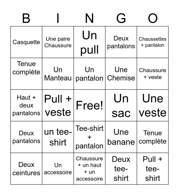 This bingo card has a free space and 24 words: un tee-shirt, Un accessoire, Un pantalon, Deux ceintures, Chaussettes + pantalon, Casquette, Tenue complète, Une paire Chaussure, Un sac, Tee-shirt + pantalon, Une Chemise, Haut + deux pantalons, Une banane, Tenue complète, Un Manteau, Deux tee-shirt, Une veste, Un pull, Chaussure + veste, Pull + veste, Pull + tee-shirt, Deux pantalons, Deux pantalons and Chaussure + un haut + un accessoire.