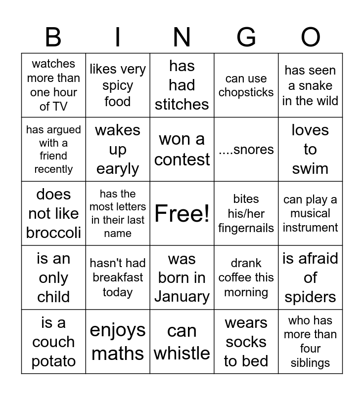 This bingo card has a free space and 24 words: hasn't had breakfast today, enjoys maths, won a contest, is a couch potato, has seen a snake in the wild, watches more than one hour of TV, has argued with a friend recently, likes very spicy food, bites his/her fingernails, was born in January, ....snores, does not like broccoli, drank coffee this morning, is afraid of spiders, wakes up earyly, wears socks to bed, can play a musical instrument, has had stitches, loves to swim, has the most letters in their last name, who has more than four siblings, is an only child, can use chopsticks and can whistle.