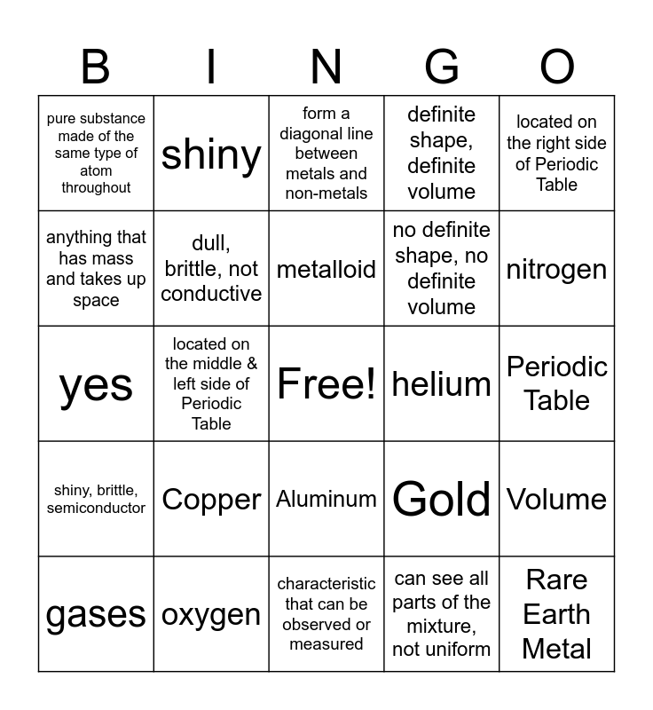 This bingo card has a free space and 33 words: takes the shape of its container, definite volume, shiny, malleable, conductive, located on the middle & left side of Periodic Table, solids, shiny, brittle, semiconductor, dull, brittle, not conductive, located on the right side of Periodic Table, gases, shiny, hydrogen, metalloid, form a diagonal line between metals and non-metals, opposite of brittle, luster, helium, nitrogen, oxygen, yes, Copper, Gold, Aluminum, Iron, pure substance made of the same type of atom throughout, Periodic Table, characteristic that can be observed or measured, Rare Earth Metal, definite shape, definite volume, no definite shape, no definite volume, anything that has mass and takes up space, Volume, solute and solvent, can see all parts of the mixture, not uniform and uniform mixture.