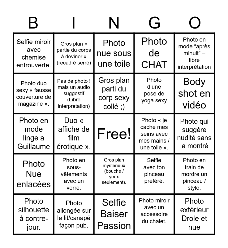 This bingo card has a free space and 24 words: Photo en sous-vêtements avec un verre., Photo allongée sur le lit/canapé façon pub., Gros plan parti du corp sexy collé ;), Photo silhouette à contre-jour., Photo en mode “après minuit” – libre interprétation, Selfie miroir avec chemise entrouverte., Photo duo sexy « fausse couverture de magazine »., Gros plan « partie du corps à deviner » (recadré serré), Photo « je cache mes seins avec mes mains / une toile »., Gros plan mystérieux (bouche / yeux seulement)., Photo d’une pose de yoga sexy, Photo en mode linge a Guillaume, Selfie avec ton pinceau préféré., Photo en train de mordre un pinceau / stylo., Pas de photo ! mais un audio suggestif (Libre interpretation), Photo miroir avec un accessoire du chalet., Photo qui suggère nudité sans la montré, Photo nue sous une toile, Body shot en vidéo, Duo « affiche de film érotique »., Photo extérieur Drole et nue, Photo Nue enlacées, Photo de CHAT and Selfie Baiser Passion.