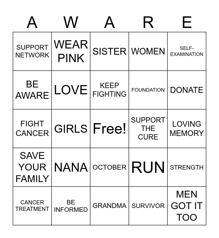 This bingo card has a free space and 24 words: NANA, BE INFORMED, KEEP FIGHTING, CANCER TREATMENT, SELF-EXAMINATION, SUPPORT NETWORK, BE AWARE, WEAR PINK, SUPPORT THE CURE, OCTOBER, FOUNDATION, FIGHT CANCER, RUN, STRENGTH, LOVE, SURVIVOR, LOVING MEMORY, SISTER, DONATE, GIRLS, MEN GOT IT TOO, SAVE YOUR FAMILY, WOMEN and GRANDMA.
