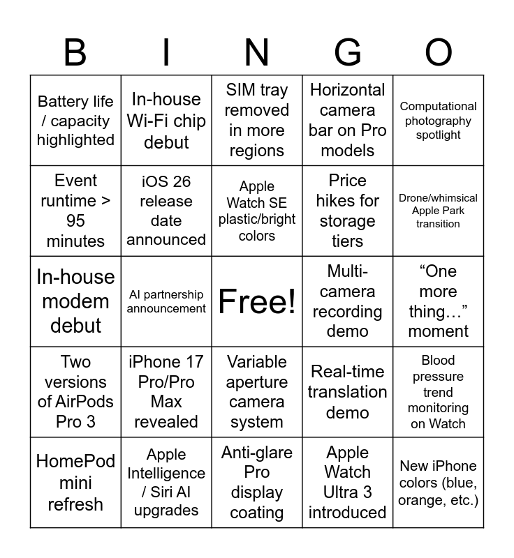 This bingo card has a free space and 44 words: iPhone 17 Air announced, iPhone 17 Pro/Pro Max revealed, Apple Watch Series 11 shown, Apple Watch Ultra 3 introduced, Apple Watch SE 3 teased, AirPods Pro 3 with health sensors, iOS 26 release date announced, A19 / A19 Pro chip mentioned, Horizontal camera bar on Pro models, New iPhone colors (blue, orange, etc.), Battery life / capacity highlighted, Apple Intelligence / Siri AI upgrades, Real-time translation demo, “One more thing…” moment, Stock price / market reaction mentioned, Return of aluminum casing on Pro, Anti-glare Pro display coating, Multi-camera recording demo, Cross-body strap case accessory, In-house modem debut, In-house Wi-Fi chip debut, Variable aperture camera system, 48MP telephoto camera upgrade, Computational photography spotlight, 8K video capture demo, “Apple Watch X” anniversary edition, Apple Watch SE plastic/bright colors, FineWoven 2.0 or new fabric case, Blood pressure trend monitoring on Watch, HomePod mini refresh, SIM-free iPhone expansion, SIM tray removed in more regions, Half-glass chassis design, Smaller Dynamic Island, Two versions of AirPods Pro 3, iPhone 17 Pro Max > 5000mAh battery, Pro Max thicker but lighter, Bold new Pro color (orange, etc.), Drone/whimsical Apple Park transition, Event runtime > 95 minutes, AI partnership announcement, Folding iPhone roadmap hint, Price hikes for storage tiers and Tariff / India production pricing mention.
