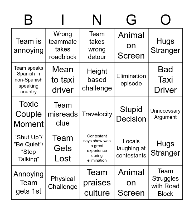 This bingo card has a free space and 29 words: Annoying Team gets 1st, Editing makes elimination closer than it seems, Team misreads clue, Music/Dance Based Challenge, Team is annoying, Team takes wrong detour, Mean to taxi driver, Team Gets Lost, Stupid Decision, Physical Challenge, Unnecessary Argument, Team Struggles with Road Block, Team praises culture, Animal on Screen, Bad Taxi Driver, Wrong teammate takes roadblock, Contestant says show was a great experience during elimination, “Shut Up”/ ”Be Quiet”/ “Stop Talking”, Hugs Stranger, Toxic Couple Moment, Locals laughing at contestants, Person with fear goes on show, Elimination episode, Team speaks Spanish in non-Spanish speaking country, Animal on Screen, Wrong teammate takes roadblock, Hugs Stranger, Height based challenge and Team is annoying.