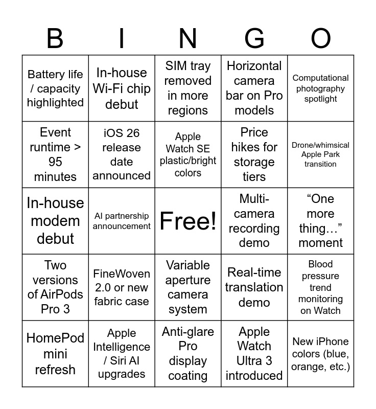 This bingo card has a free space and 44 words: iPhone 17 Air announced, FineWoven 2.0 or new fabric case, Apple Watch Series 11 shown, Apple Watch Ultra 3 introduced, Two versions of AirPods Pro 3, AirPods Pro 3 with health sensors, iOS 26 release date announced, A19 / A19 Pro chip mentioned, Horizontal camera bar on Pro models, New iPhone colors (blue, orange, etc.), Battery life / capacity highlighted, Apple Intelligence / Siri AI upgrades, Real-time translation demo, “One more thing…” moment, Stock price / market reaction mentioned, Return of aluminum casing on Pro, Anti-glare Pro display coating, Multi-camera recording demo, Cross-body strap case accessory, In-house modem debut, In-house Wi-Fi chip debut, Variable aperture camera system, 48MP telephoto camera upgrade, Computational photography spotlight, 8K video capture demo, “Apple Watch X” anniversary edition, Apple Watch SE plastic/bright colors, FineWoven 2.0 or new fabric case, Blood pressure trend monitoring on Watch, HomePod mini refresh, SIM-free iPhone expansion, SIM tray removed in more regions, Half-glass chassis design, Smaller Dynamic Island, Two versions of AirPods Pro 3, iPhone 17 Pro Max > 5000mAh battery, Pro Max thicker but lighter, Bold new Pro color (orange, etc.), Drone/whimsical Apple Park transition, Event runtime > 95 minutes, AI partnership announcement, Folding iPhone roadmap hint, Price hikes for storage tiers and Tariff / India production pricing mention.
