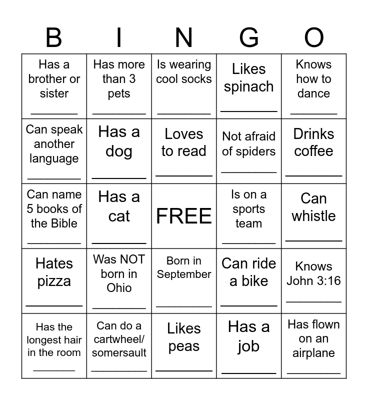This bingo card has a free space and 39 words: Can open their eyes underwater _________, Is wearing jeans ________, Plays an instrument ________, Has a dog ______, Has the longest hair in the room _______, Born in September _________, Loves to read _______, Can juggle _______, Knows how to dance _______, Hates pizza _______, Has a cat ______, Likes spinach _______, Has flown on an airplane ________, Can whistle _______, Is on a sports team ________, Was NOT born in Ohio ________, Wearing something Orange _______, Has a brother or sister _______, Is left handed _______, Can ride a bike _______, Can speak another language ________, Likes peas _______, Not afraid of spiders ________, Drinks coffee _______, Has braces ______, Wears glasses ______, Has colored shoelaces ________, Has pierced ears ________, Loves pickles _______, Has more than 3 pets ________, Has curly hair _______, Rides horses _______, Is wearing cool socks ________, Can do a cartwheel/ somersault _________, Has a job ______, Can touch their nose with their tongue __________, Knows John 3:16 ________, Can name 5 books of the Bible ________ and Has volunteered _________.