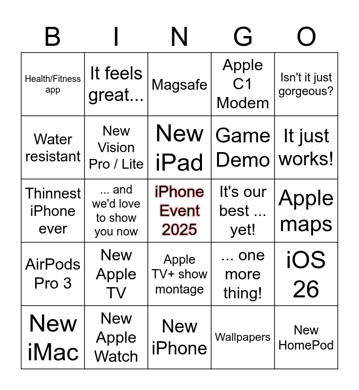 This bingo card has a free space and 25 words: New Apple TV, New iPhone, New iPad, New iMac, Isn't it just gorgeous?, Health/Fitness app, Water resistant, It feels great..., It's our best ... yet!, Apple TV+ show montage, Game Demo, Thinnest iPhone ever, ... one more thing!, iOS 26, New Vision Pro / Lite, watchOS 26, Apple maps, Magsafe, It just works!, ... and we'd love to show you now, New HomePod, New Apple Watch, AirPods Pro 3, Apple C1 Modem and Wallpapers.