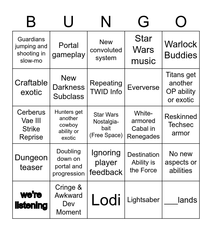 This bingo card has a free space and 24 words: Doubling down on portal and progression, Cringe & Awkward Dev Moment, Repeating TWID Info, we're listening, Warlock Buddies, Guardians jumping and shooting in slow-mo, Craftable exotic, Portal gameplay, White-armored Cabal in Renegades, Ignoring player feedback, Eververse, Cerberus Vae III Strike Reprise, Destination Ability is the Force, No new aspects or abilities, New Darkness Subclass, Lightsaber, Reskinned Techsec armor, New convoluted system, Titans get another OP ability or exotic, Hunters get another cowboy ability or exotic, ___lands, Dungeon teaser, Star Wars music and Lodi.