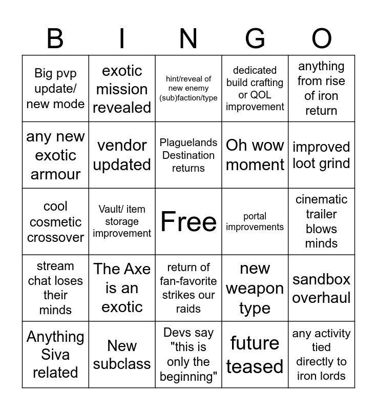 This bingo card has a free space and 24 words: The Axe is an exotic, New subclass, Plaguelands Destination returns, Anything Siva related, anything from rise of iron return, Big pvp update/ new mode, any new exotic armour, exotic mission revealed, portal improvements, return of fan-favorite strikes our raids, Oh wow moment, cool cosmetic crossover, new weapon type, sandbox overhaul, vendor updated, future teased, cinematic trailer blows minds, hint/reveal of new enemy (sub)faction/type, improved loot grind, Vault/ item storage improvement, any activity tied directly to iron lords, stream chat loses their minds, dedicated build crafting or QOL improvement and Devs say "this is only the beginning".