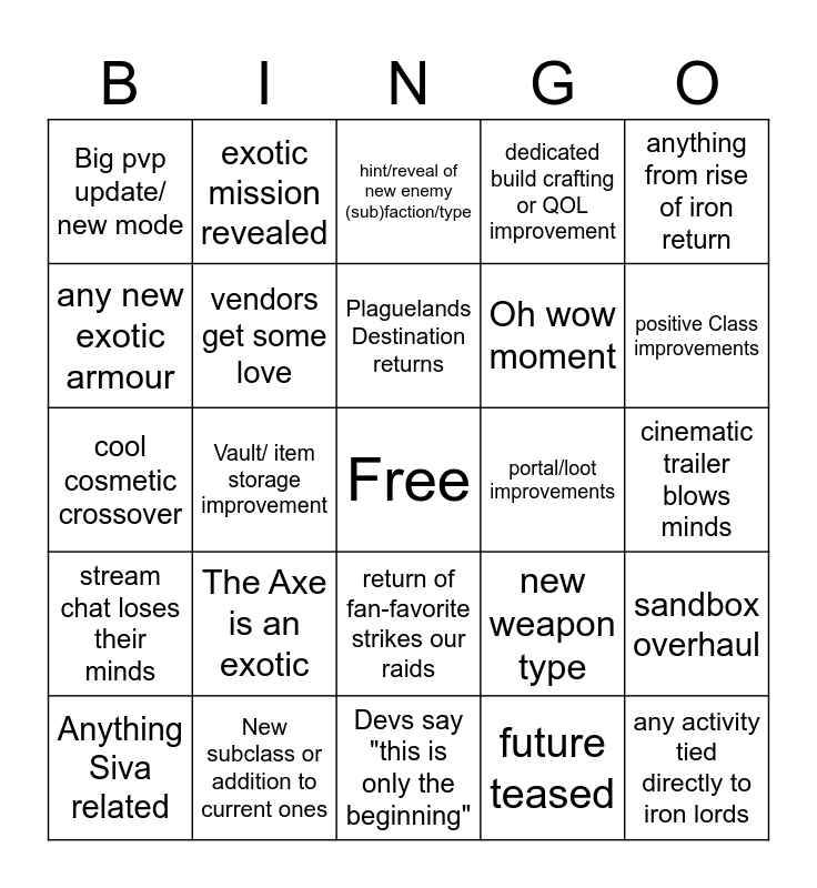 This bingo card has a free space and 24 words: The Axe is an exotic, New subclass or addition to current ones, Plaguelands Destination returns, Anything Siva related, anything from rise of iron return, Big pvp update/ new mode, any new exotic armour, exotic mission revealed, portal/loot improvements, return of fan-favorite strikes our raids, Oh wow moment, cool cosmetic crossover, new weapon type, sandbox overhaul, vendors get some love, future teased, cinematic trailer blows minds, hint/reveal of new enemy (sub)faction/type, positive Class improvements, Vault/ item storage improvement, any activity tied directly to iron lords, stream chat loses their minds, dedicated build crafting or QOL improvement and Devs say "this is only the beginning".
