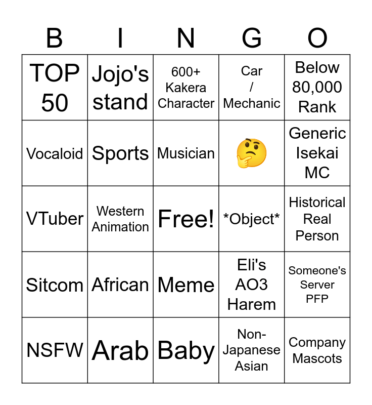 This bingo card has a free space and 24 words: African, Arab, Musician, NSFW, Below 80,000 Rank, TOP 50, Vocaloid, Jojo's stand, *Object*, Meme, 🤔, VTuber, Eli's AO3 Harem, Someone's Server PFP, Sports, Non-Japanese Asian, Historical Real Person, 600+ Kakera Character, Generic Isekai MC, Western Animation, Company Mascots, Sitcom, Car / Mechanic and Baby.