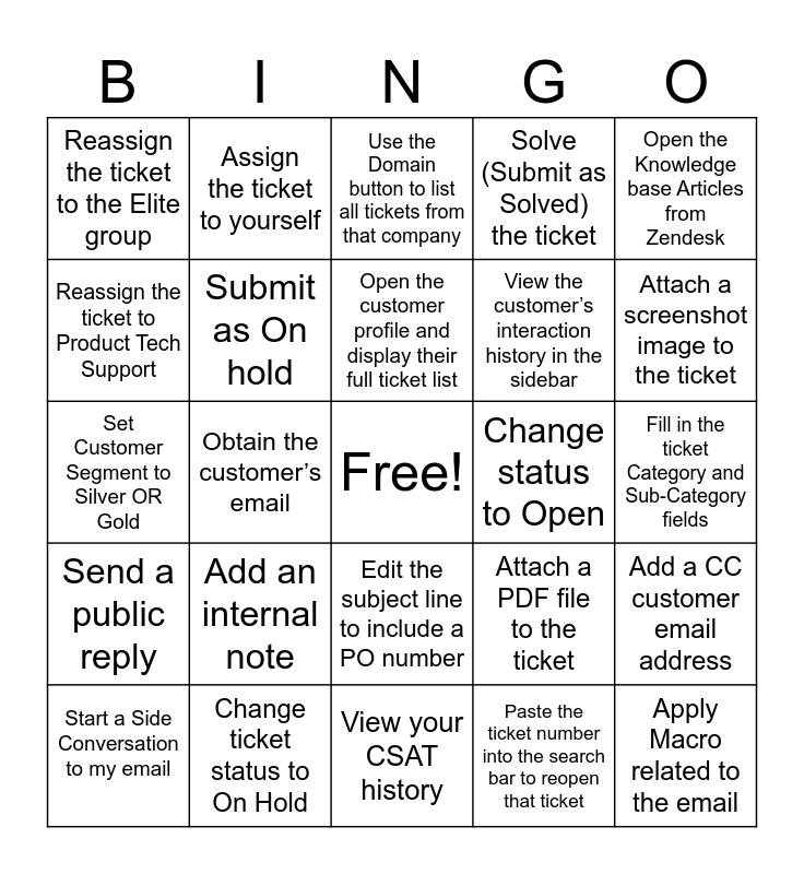 This bingo card has a free space and 24 words: Add an internal note, Change ticket status to On Hold, Open the customer profile and display their full ticket list, Start a Side Conversation to my email, Open the Knowledge base Articles from Zendesk, Reassign the ticket to the Elite group, Reassign the ticket to Product Tech Support, Assign the ticket to yourself, Change status to Open, Edit the subject line to include a PO number, View the customer’s interaction history in the sidebar, Set Customer Segment to Silver OR Gold, Attach a PDF file to the ticket, Add a CC customer email address, Submit as On hold, Paste the ticket number into the search bar to reopen that ticket, Fill in the ticket Category and Sub-Category fields, Use the Domain button to list all tickets from that company, Attach a screenshot image to the ticket, Obtain the customer’s email, Apply Macro related to the email, Send a public reply, Solve (Submit as Solved) the ticket and View your CSAT history.