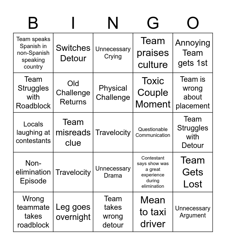 This bingo card has a free space and 37 words: Team is annoying, Stupid Decision, Bad Taxi Driver, Old Challenge Returns, Team Gets Lost, Travelocity, Physical Challenge, Music/Dance Based Challenge, Annoying Team gets 1st, Editing makes elimination closer than it seems, Team misreads clue, Team praises culture, Unnecessary Argument, Team Struggles with Detour, Team Struggles with Roadblock, Non-elimination Episode, Elimination episode, Unnecessary Crying, Unnecessary Drama, Questionable Communication, Team speaks Spanish in non-Spanish speaking country, Team is wrong about placement, Wrong teammate takes roadblock, Team takes wrong detour, Person with fear goes on show, Mean to taxi driver, Switches Detour, “Shut Up”/ ”Be Quiet”/ “Stop Talking”, Hugs Stranger, Animal on Screen, Height based challenge, Leg goes overnight, Locals laughing at contestants, Contestants say they are proud of partner during elimination, Contestant says show was a great experience during elimination, Toxic Couple Moment and Penalty.