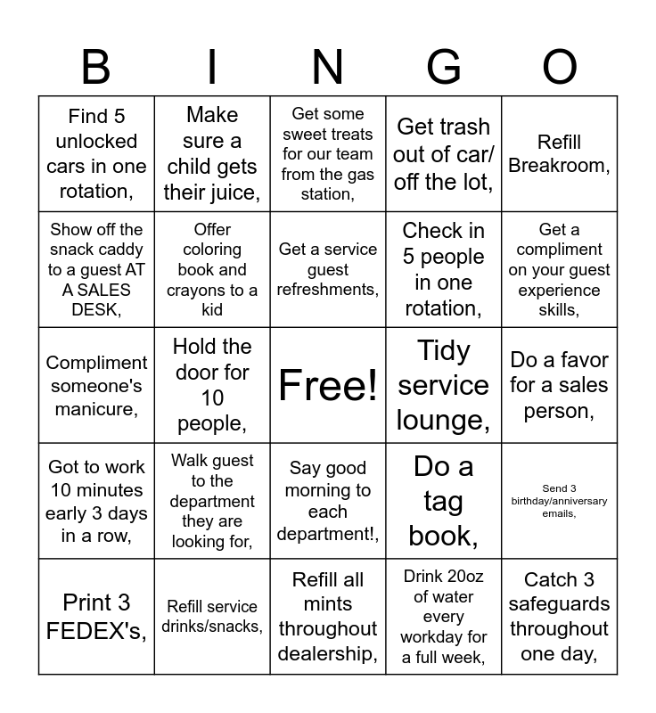 This bingo card has a free space and 26 words: Say good morning to each department!,, Drink 20oz of water every workday for a full week,, Get a service guest refreshments,, Refill service drinks/snacks,, Refill Breakroom,, Find 5 unlocked cars in one rotation,, Show off the snack caddy to a guest AT A SALES DESK,, Make sure a child gets their juice,, Do a favor for a sales person,, Do a tag book,, Check in 5 people in one rotation,, Compliment someone's manicure,, Send 3 birthday/anniversary emails,, Print 3 FEDEX's,, Hold the door for 10 people,, Say something encouraging to a Teammate,, Get trash out of car/ off the lot,, Got to work 10 minutes early 3 days in a row,, Get some sweet treats for our team from the gas station,, Catch 3 safeguards throughout one day,, Get a compliment on your guest experience skills,, Refill all mints throughout dealership,, Tidy service lounge,, Walk guest to the department they are looking for,, Offer coloring book and crayons to a kid and Go the extra mile to get a call connected..
