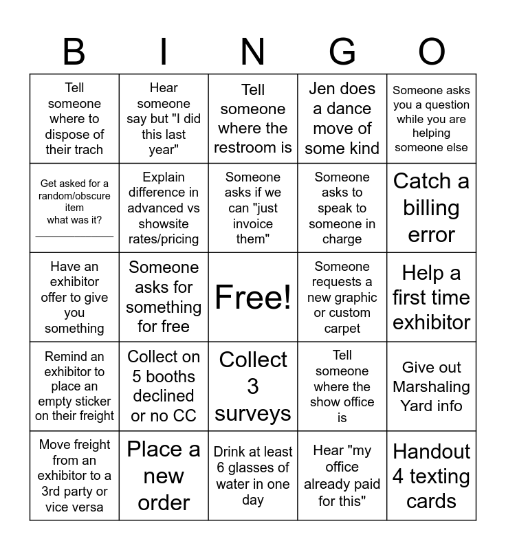 This bingo card has a free space and 24 words: Collect on 5 booths declined or no CC, Place a new order, Someone asks if we can "just invoice them", Move freight from an exhibitor to a 3rd party or vice versa, Someone asks you a question while you are helping someone else, Tell someone where to dispose of their trach, Get asked for a random/obscure item what was it? ______________, Hear someone say but "I did this last year", Someone requests a new graphic or custom carpet, Collect 3 surveys, Someone asks to speak to someone in charge, Have an exhibitor offer to give you something, Tell someone where the show office is, Give out Marshaling Yard info, Explain difference in advanced vs showsite rates/pricing, Hear "my office already paid for this", Help a first time exhibitor, Tell someone where the restroom is, Catch a billing error, Someone asks for something for free, Handout 4 texting cards, Remind an exhibitor to place an empty sticker on their freight, Jen does a dance move of some kind and Drink at least 6 glasses of water in one day.