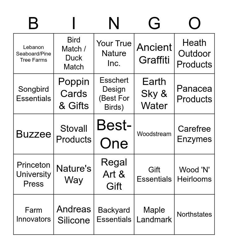This bingo card has 39 words: Free!, Vortex Optics, Brome Bird Care, Poppin Cards & Gifts, Farm Innovators, Regal Art & Gift, Esschert Design (Best For Birds), Sapphire Labs, Heath Outdoor Products, Princeton University Press, Stovall Products, Ancient Graffiti, Best-One, Carefree Enzymes, Woodstream, Nature's Way, Beakview Camera, Lebanon Seaboard/Pine Tree Farms, AdventureKeen, Gift Essentials, Songbird Essentials, Backyard Essentials, Earth Sky & Water, Panacea Products, Madd Capp Games, Briarwood Lane, Northstates, Allied Precision /Headwind, Wildlife Sciences, Bird Match / Duck Match, Hilltop Specialties, Lone Wolf, Your True Nature Inc., Andreas Silicone, Maple Landmark, NOCS Provisions, Wood 'N' Heirlooms, Buzzee and Woodpecker Products Inc..
