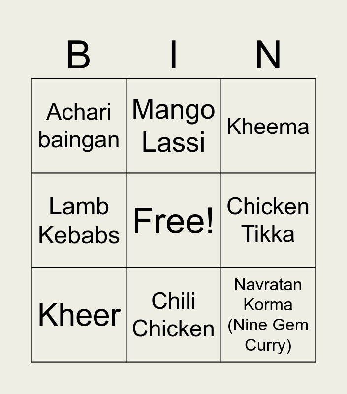 This bingo card has a free space and 136 words: Alu Gobi, Alu Matar, Barfi, Beef Vindaloo, Butter Chicken, Carrot Halwa, Chaat Papri, Cham-Cham, Chana Dal, Chana Masala, Chapati, Chicken 65, Chicken Biriyani, Chicken Tikka, Chili Chicken, Coriander Chutney, Dal Makhani, Date Tamarind Chutney, Dhokla, Gulab Jamun, Idili, Jalebi, Kheema, Kheer, Kulfi, Ladoo, Lamb Kebabs, Lamb Vindaloo, Lime Pickle, Maili Kofta, Mango Lassi, Masala Chai, Masala Dosa, Masoor Dal, Medu Vada, Naan, Navratan Korma (Nine Gem Curry), Onion Pakora, Papadum, Pulao, Raita, Rajma, Ras Malai, Rogan Josh, Saag Paneer, Sambar, Samosa, Tandoori Chicken, Uthapam, Vegetable Jalfrezi, Barfi, Beef Vindaloo, Butter Chicken, Carrot Halwa, Chaat Papri, Alu Gobi, Alu Matar, Chana Masala, Chapati, Chicken 65, Chicken Biriyani, Chicken Tikka, Cham-Cham, Chana Dal, Dal Makhani, Date Tamarind Chutney, Dhokla, Gulab Jamun, Idili, Chili Chicken, Coriander Chutney, Kheer, Kulfi, Ladoo, Lamb Kebabs, Lamb Vindaloo, Jalebi, Kheema, Mango Lassi, Masala Chai, Masala Dosa, Masoor Dal, Medu Vada, Lime Pickle, Maili Kofta, Onion Pakora, Papadum, Pulao, Raita, Rajma, Naan, Navratan Korma (Nine Gem Curry), Saag Paneer, Sambar, Samosa, Tandoori Chicken, Uthapam, Ras Malai, Rogan Josh, Tamrind Rice, Yoghurt Rice, Achari baingan, Aloo gobi, Aloo tikki, Vegetable Jalfrezi, Paratha, Aloo methi, Bhindi masala, Biryani, Chole bhature, Dum aloo, Aloo matar, Aloo kulcha, Gajar matar aloo, Gobhi matar, Kachori, Kadai paneer, Kadhi pakoda, Poha, phirni, Kulfi falooda, Laapsi, Missi roti, Navrattan korma, Palak paneer, Khichdi, Kofta, Pani puri, Rajma chaval, Lobiya, Shahi tukra, Sooji halwa (Suji Lapsi), Paneer butter masala, Paneer tikka masala, Vegetable jalfrezi and Tandoori Fish Tikka.