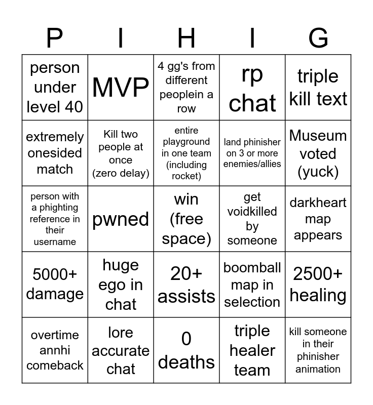 This bingo card has a free space and 24 words: huge ego in chat, lore accurate chat, entire playground in one team (including rocket), overtime annhi comeback, triple kill text, person under level 40, extremely onesided match, MVP, get voidkilled by someone, 20+ assists, land phinisher on 3 or more enemies/allies, person with a phighting reference in their username, boomball map in selection, 2500+ healing, Kill two people at once (zero delay), triple healer team, darkheart map appears, 4 gg's from different peoplein a row, Museum voted (yuck), pwned, kill someone in their phinisher animation, 5000+ damage, rp chat and 0 deaths.
