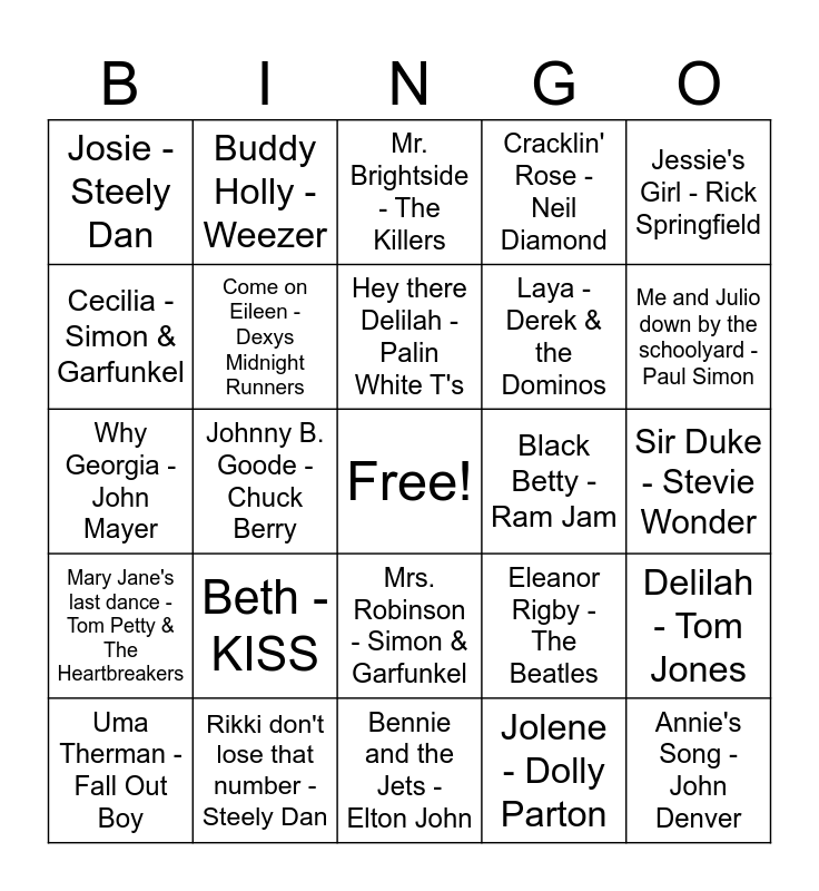 This bingo card has a free space and 50 words: Alison - Elvis Costello, Annie's Song - John Denver, Baba O'Riley - The Who, Bennie and the Jets - Elton John, Beth - KISS, Billie Jean - Michael Jackson, Buddy Holly - Weezer, Casey Jones - Grateful Dead, Cecilia - Simon & Garfunkel, Clint Eastwood - Gorillaz, Come on Eileen - Dexys Midnight Runners, Cracklin' Rose - Neil Diamond, Delilah - Tom Jones, Eleanor Rigby - The Beatles, Fernando - ABBA, Hey Jude - The Beatles, Hey there Delilah - Palin White T's, Black Betty - Ram Jam, Iris - The Goo Goo Dolls, Jessie's Girl - Rick Springfield, Johnny B. Goode - Chuck Berry, Jolene - Dolly Parton, Josie - Steely Dan, Laya - Derek & the Dominos, Maggie May - Rod Stewart, Marvin Gaye - Charlie Puth, Meghan Trainor, Me and Julio down by the schoolyard - Paul Simon, Michelle - The Beatles, Mr. Brightside - The Killers, Mrs. Robinson - Simon & Garfunkel, Ms. Jackson - Outkast, Mustang Sally - Wilson Pickett, Ophelia - The Lumineers, Rhiannon - Fleetwood Mac, Rikki don't lose that number - Steely Dan, Rosanna - Toto, Roxanne - The Police, Run around Sue - Dion, Sherry - Franki Valli & The Four Seasons, Sir Duke - Stevie Wonder, Stacy's Mom - Fountians of Wayne, Sweet Caroline - Neil Diamond, Tom Sawyer - Rush, Tom's Diner - Suzanne Vega, Uma Therman - Fall Out Boy, Why Georgia - John Mayer, You can call me Al - Paul Simon, Angie - The Rolling Stones, Mary Jane's last dance - Tom Petty & The Heartbreakers and Valerie - Mark Ronson, Amy Winehouse.