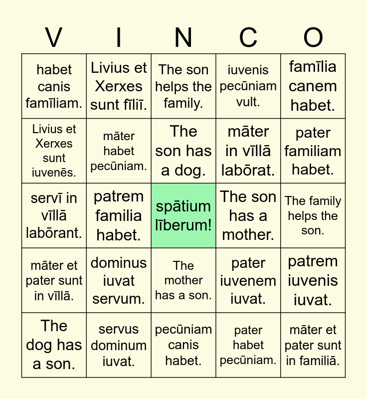 This bingo card has a free space and 24 words: dominus iuvat servum., servus dominum iuvat., The son has a dog., The dog has a son., famīlia canem habet., habet canis famīliam., Livius et Xerxes sunt iuvenēs., Livius et Xerxes sunt fīliī., The son has a mother., The mother has a son., māter in vīllā labōrat., servī in vīllā labōrant., pater iuvenem iuvat., patrem iuvenis iuvat., māter habet pecūniam., pater habet pecūniam., The family helps the son., The son helps the family., pater familiam habet., patrem familia habet., māter et pater sunt in familiā., māter et pater sunt in vīllā., iuvenis pecūniam vult. and pecūniam canis habet..