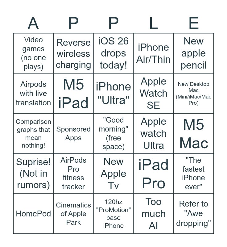 This bingo card has a free space and 49 words: Too much Apple Tv+ and Fitness+, Refer to "Awe dropping", "Releasing next week", 120hz "ProMotion" base iPhone, AirPods Pro fitness tracker, iPhone 17 looks like 16, Reverse wireless charging, AI used in unlikely scenarios, Airpods with live translation, iPhone 17e, M5 iPad, iPhone Air/Thin, "The fastest iPhone ever", iPad Pro, "One more thing...", MacBook Pro, iPhone "Ultra", Apple watch Ultra, Base iPad, New apple pencil, Sponsored Apps, Too much AI, Video games (no one plays), Apple Watch SE, Craig does parcour/sometjing crazy, New Desktop Mac (Mini/iMac/Mac Pro), HomePod, HomePod with AI, New Apple Tv, Suprise! (Not in rumors), Carplay Ultra, Nobody asked for this!, Orange Pro Model, "iPhone 26", Cinematics of Apple Park, Battery case for iPhone Air, Apple Bumper case for 17 Air, iPad Air/Mini, M5 Mac, Foldable (pls apple), "Product available today", "Product available next week", Existing feature in more places., "Eco friendly by 2030" mention, Comparison graphs that mean nothing!, iOS 26 drops today!, M5 variants (pro/max/ultra), New Vision (pro/other) and Event under 2 hours.
