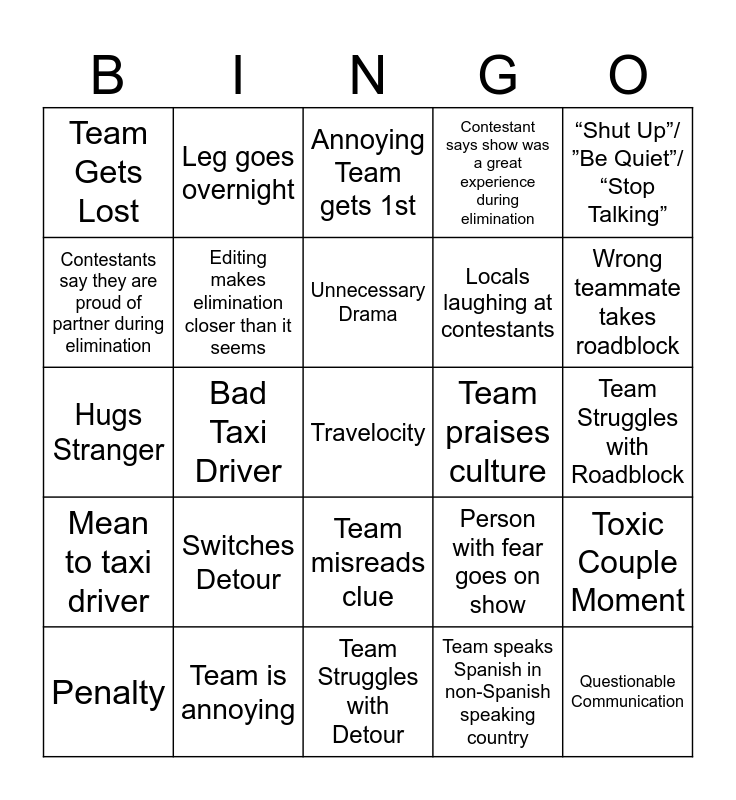 This bingo card has a free space and 30 words: Team is annoying, Stupid Decision, Bad Taxi Driver, Old Challenge Returns, Team Gets Lost, Annoying Team gets 1st, Editing makes elimination closer than it seems, Team misreads clue, Team praises culture, Team Struggles with Detour, Team Struggles with Roadblock, Questionable Communication, Team speaks Spanish in non-Spanish speaking country, Team is wrong about placement, Wrong teammate takes roadblock, Team takes wrong detour, Person with fear goes on show, Mean to taxi driver, Switches Detour, “Shut Up”/ ”Be Quiet”/ “Stop Talking”, Hugs Stranger, Animal on Screen, Leg goes overnight, Locals laughing at contestants, Contestants say they are proud of partner during elimination, Contestant says show was a great experience during elimination, Toxic Couple Moment, Penalty, Unnecessary Drama and Physical Challenge.