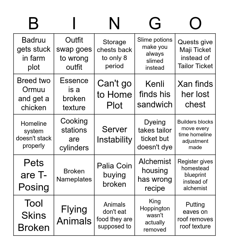 This bingo card has a free space and 24 words: Broken Nameplates, Flying Animals, Can't go to Home Plot, Tool Skins Broken, Quests give Maji Ticket instead of Tailor Ticket, Badruu gets stuck in farm plot, Breed two Ormuu and get a chicken, Outfit swap goes to wrong outfit, Dyeing takes tailor ticket but doesn't dye, Palia Coin buying broken, Kenli finds his sandwich, Homeline system doesn't stack properly, Alchemist housing has wrong recipe, Register gives homestead blueprint instead of alchemist, Essence is a broken texture, King Hoppington wasn't actually removed, Builders blocks move every time homeline adjustment made, Storage chests back to only 8 period, Xan finds her lost chest, Cooking stations are cylinders, Putting eaves on roof removes roof texture, Pets are T-Posing, Slime potions make you always slimed instead and Animals don't eat food they are supposed to.