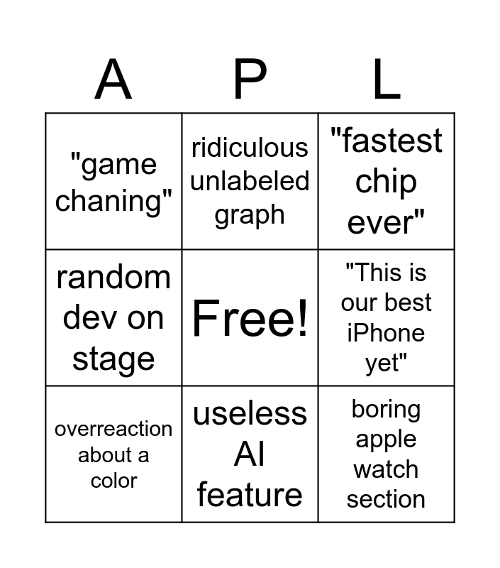 This bingo card has a free space and 8 words: "This is our best iPhone yet", "fastest chip ever", ridiculous unlabeled graph, overreaction about a color, "game chaning", boring apple watch section, random dev on stage and useless AI feature.