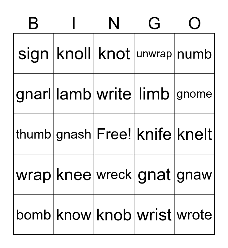 This bingo card has a free space and 29 words: knit, know, knot, wren, numb, sign, lamb, write, knife, gnaw, bomb, gnash, wrist, wrote, thumb, wrench, knob, gnat, gnome, wrap, knee, comb, limb, knelt, gnarl, knoll, wreck, unwrap and limb.