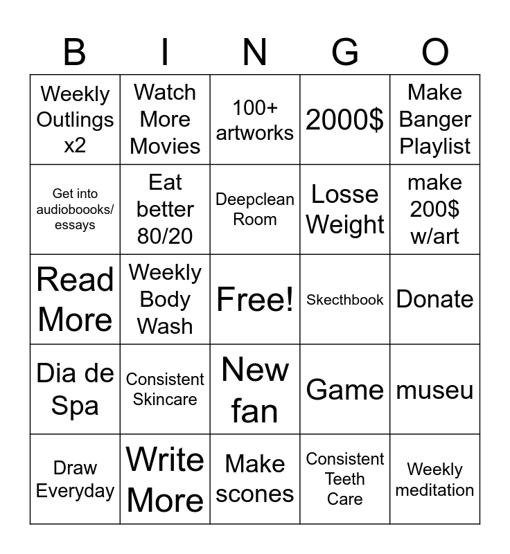 This bingo card has a free space and 24 words: Consistent Skincare, Write More, Deepclean Room, Draw Everyday, Make Banger Playlist, Weekly Outlings x2, Get into audioboooks/ essays, Watch More Movies, Skecthbook, New fan, Losse Weight, Read More, Game, museu, Eat better 80/20, Consistent Teeth Care, Donate, 100+ artworks, make 200$ w/art, Weekly Body Wash, Weekly meditation, Dia de Spa, 2000$ and Make scones.