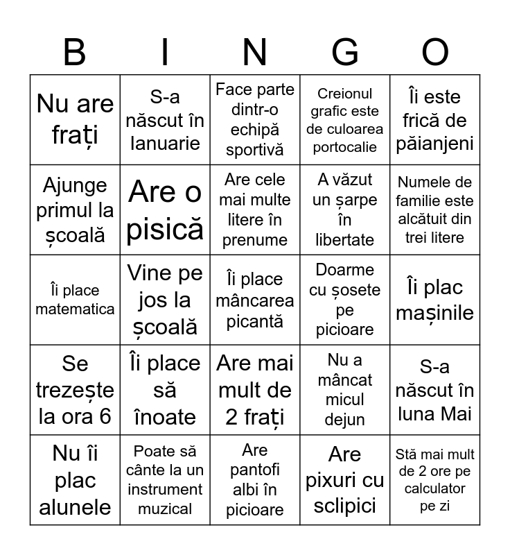 This bingo card has a free space and 24 words: Îi place să înoate, Poate să cânte la un instrument muzical, Are cele mai multe litere în prenume, Nu îi plac alunele, Îi este frică de păianjeni, Nu are frați, Ajunge primul la școală, S-a născut în Ianuarie, Doarme cu șosete pe picioare, Are mai mult de 2 frați, A văzut un șarpe în libertate, Îi place matematica, Nu a mâncat micul dejun, S-a născut în luna Mai, Are o pisică, Are pixuri cu sclipici, Îi plac mașinile, Face parte dintr-o echipă sportivă, Numele de familie este alcătuit din trei litere, Vine pe jos la școală, Stă mai mult de 2 ore pe calculator pe zi, Se trezește la ora 6, Creionul grafic este de culoarea portocalie and Are pantofi albi în picioare.